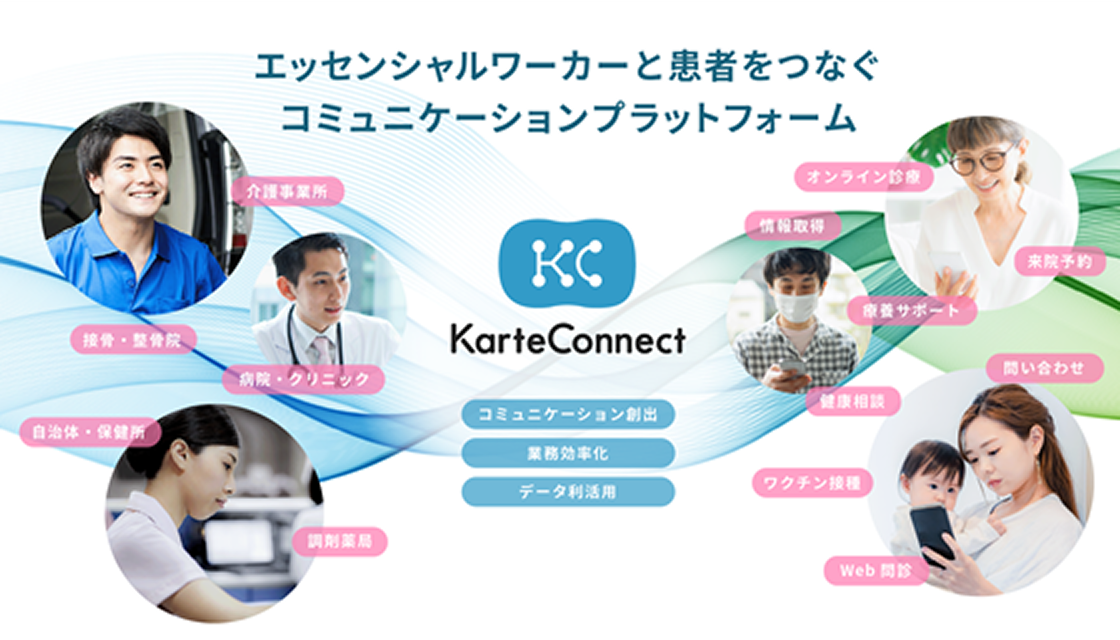医療・介護業界向けのDXプラットフォーム「KarteConnect」を提供。予約・問診・カルテ連携から薬剤の発注・在庫管理など、業務効率化による現場リソースの最適化と患者満足度向上を実現します。